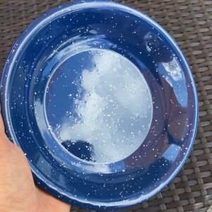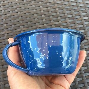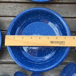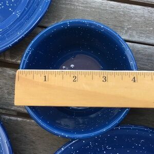 Vintage Speckle Enamel Set Bowls Cups Spoons Blue White Camping Gear Rustic