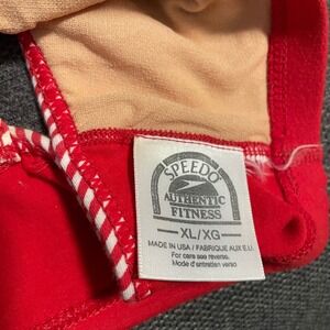 Made in the USA, this rare Speedo set is from the late 80s or early 90s and has a bold Baywatch-inspired look with its bright red color and sporty striped trim. Whether worn as a collectible piece or a retro athleisure outfit, it captures classic vintage fitness style with a fun, iconic vibe. This would be great for a lifeguard or even as lifeguard or Baywatch costume.
