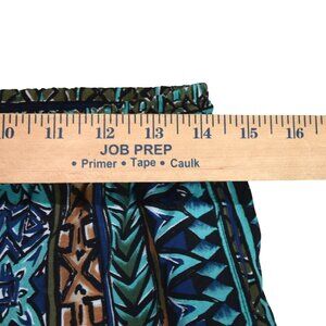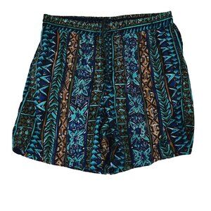 These vintage Speedo swim trunks bring a vibrant retro flair with their bold teal, navy, and earth-tone Aztec-inspired pattern. Made in Taiwan, they feature classic 90s styling, an elastic waistband, internal mesh lining, and a lightweight quick-dry feel. Marked men’s size small.