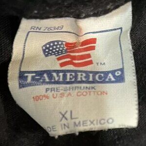 This vintage Jaegermeister JAEGERMEISTER T-Shirt is a must-have for any collector or fan of the iconic logo. Made by T-America in Mexico, this black graphic tee features the beloved deer with cross logo and is crafted from 100% cotton in a regular fit. The short sleeve crew neck shirt is perfect for casual occasions in the fall season and is machine washable for easy care. The shirt is available in XL size and is an original piece, not a reproduction. Add this unique item to your collection or wear it proudly as a fan of Jaegermeister.