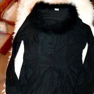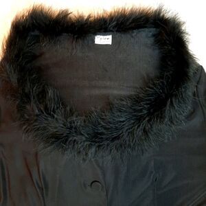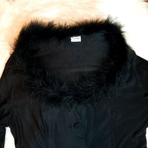 Rare vintage made of polyester I love this blouse feathers are excellent on the blouse .. Spice Black Feather Collar Long Sleeve Fitted Blouse Sz L. Condition is Pre-owned. Shipped with USPS First Class Package. Ex condtion clean pet free smoke fee Really one of a kind dress fitted blouse. Measures 21 W 28 L 18 inch sleeves stretch blouse Collar on very well no loose spots not really worn .