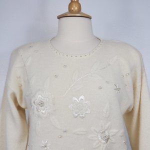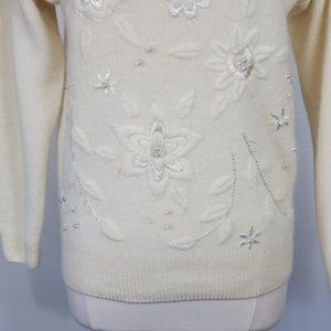 Vintage Spice of Life Cream Beaded Embroidered Lambs Wool Angora Sweater, M
