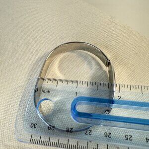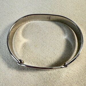 This vintage bracelet offers a timeless aesthetic with its silver-tone finish, engraved personalization, and hinged design, fitting comfortably on the wrist.