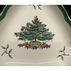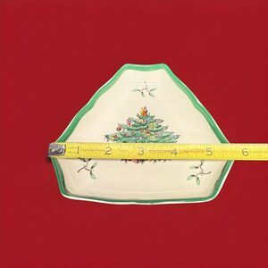 Add a vintage touch to your home with this beautiful Spode Christmas tree trinket/candy dish. The dish features a festive design of a Christmas tree, holly berries and a triangle shape, perfect for holding your favorite candies or small trinkets. Made of high-quality porcelain with a glossy finish, this dish is sure to impress your guests and become a treasured addition to your collection.