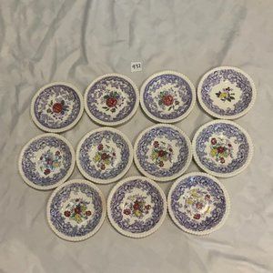 Vintage Spode Mulberry Beverly purple china larger 6 in fruit/dessert (sauce) bowl set. Beautiful hand painted floral designs. Minor stains and chips. Whole set contains 11 bowls. Leave a comment if interested in purchasing pieces individually. Perfect bowl set for nice dinners.