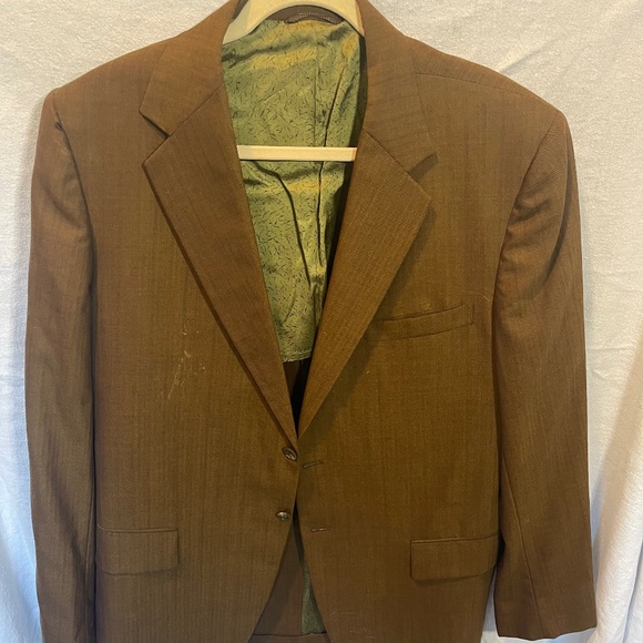 This is a vintage sport coat. It doesn't have a size tag, but I'm estimating it's 46R. The color is a unique golden tan. Non-smoking home.