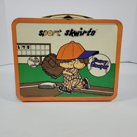 This vintage metal lunch box from 1972 features playful Sport Skwirts designs with Jimmy Blooper and Frankie Fumble. Its nostalgic charm is perfect for collectors or fans of retro memorabilia.