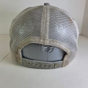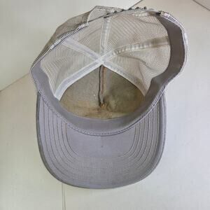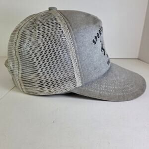 This is a vintage trucker snapback hat from Sportsmen’s Stop on I-35 in Hinckley, Minnesota. Features hunting and fishing graphics with a deer and fish illustration. The hat has a foam front with mesh back. Please note the foam has completely deteriorated (foam rot), causing staining and discoloration on the crown. Still a collectible regional advertising cap for display or restoration.