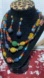 Primary colorful beads, with specks and designs separated by smooth beads. The necklace measures 60 inches. The pierced earrings have a matching blue bead and measures 2.25 inches.