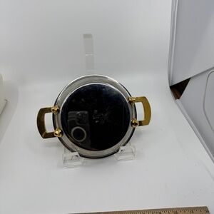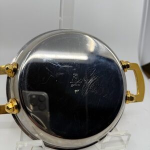 BEAUTIFUL LKE NEW SPRING GOLDSTAR GL 84 85 Au Gratin Pan with gold-plated brass handle. This is a gorgeous pan made in Switzerland by Spring, well known for making some of the finest cookware in the world. Bought this on my honeymoon in Switzerland late 1970's. It is a beautiful combination of stainless steel (INOX) and brass to make smooth transition from oven or stovetop to table. The secret and essence of this technology is the low need for water when using Goldstar-GL cookware, which can leach vitamins and minerals from the food you cook. .It measures 9 1/4"" Handle to handle, and 7" diameter top. The pan is 1 7/8"" deep. This is a gently used ,like new pan, but does have a few light scratches and finger prints/slight discoloration from age that will most likely will diminish with polishing. Ive never seen the line in the USA. Its a beautiful pan. At posting I have two ( a pair)