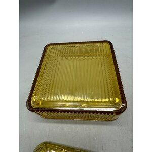 This amber glass refrigerator dish features a ribbed design and comes with a matching lid. Ideal for functional kitchen storage or vintage decor.