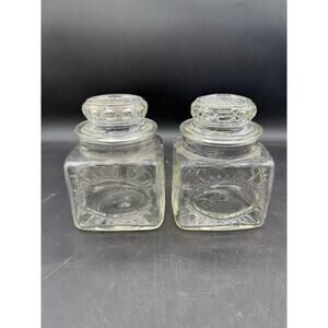 Pair of vintage square clear glass vanity jars featuring a charming sunburst pattern on the lids. Each jar measures 4.5" tall by 3.5" wide. Perfect for storing small trinkets, jewelry, or bathroom essentials. In excellent vintage condition with minimal wear. Great vintage find!! Great value!!