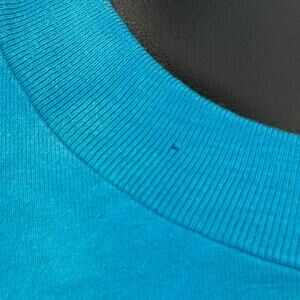 Has a spot on the lower back, light pilling, light image cracking, and a hole on the first layer of collar fabric. No other flaws noticed. Tag is a X-Large but I feel it measures more similar to a modern Large. Check measurements to ensure fit. See photos.