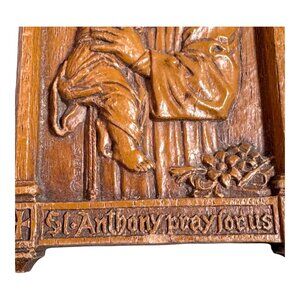 Vintage St. Anthony Pray For Us Religious Wall Plaque Brown Wooden Barwood Mini