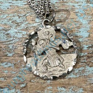 Vintage sterling silver St. Christopher Necklace. Pendant has a diameter of 18mm. Chain is 18” long. Both marked sterling. Weight: 3.7 grams. Genderless design.