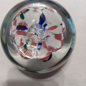 Beautiful heavyweight crystal clear glass paperweight, controlled bubbles, crimped floral ribbon interior colors of white, royal blue, barbie pink and emeral green. Bottom is stamped St. Clair. No chips, cracks etc. EUC. Smoke free pet free home.