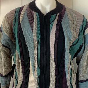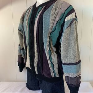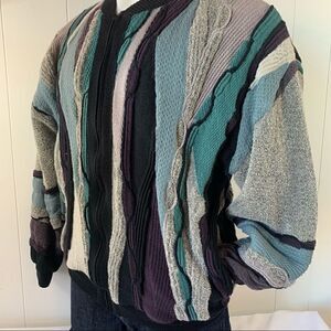 Coogi style textured knit in gray, black, purple and blue