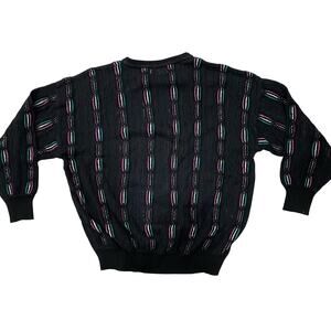 Vintage St. Croix for Moshers black pullover sweater - this is a chunky 1980's relaxed oversized look - Men's US size M - 100% cotton knit. Black textured knit with geometric bands of purple, green and white - a fantastic unisex style. This one is a classic! In excellent vintage condition - minimal wear - no damage or flaws.