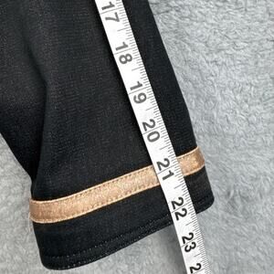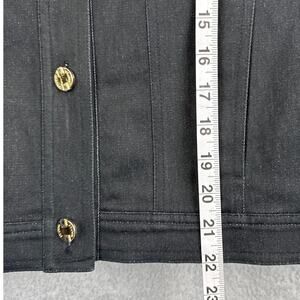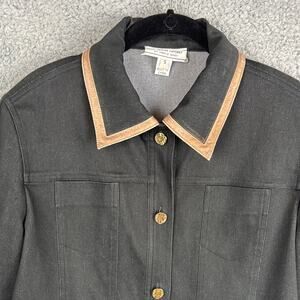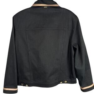Vintage St. John Black Denim Jacket Leather Trim Signature Gold Buttons Designer