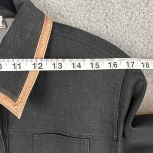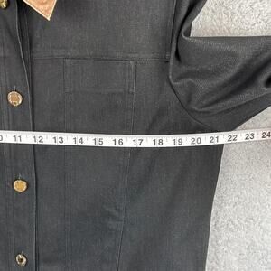 Vintage St. John Black Denim Jacket with Leather Trim and Signature Gold Buttons. This sophisticated piece exudes luxury with its rare design and iconic details. Perfect for adding a touch of elegance to any wardrobe. A true collector's item for fashion enthusiasts.