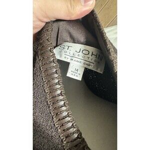 This Vintage St. John Brown Tweed Set includes a jacket in size 14 and a skirt in size 10, perfect for a business occasion. The set is a 2-piece skirt suit made from a wool blend tweed fabric with a solid brown color and a silk lining. The jacket features long sleeves and a single-breasted cut, while the skirt has an elastic waist for comfort. Made in the United States, this vintage set is ideal for the winter, fall, and spring seasons and should be dry cleaned only to maintain its quality. The timeless style and quality construction make this set a versatile addition to any wardrobe.