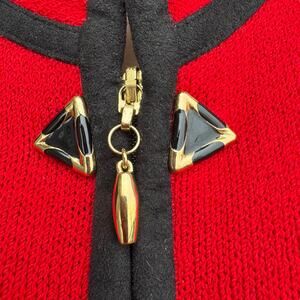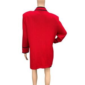This garment features the brand's signature Santana Knit (a wool/rayon blend, though the material tag is missing). It is a bold red color complemented by elegant black trim along the collar and edges.