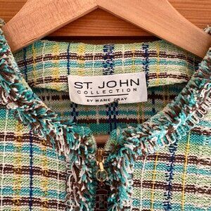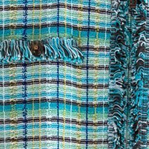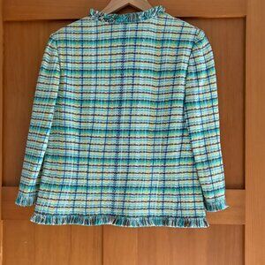 Aqua plaid, fringed sweater jacket from the 2005 Resort collection (see "CR" on tag). Very Chanel inspired. The plaid is primarily a light teal/aqua blue with stripes of chocloate brown and yellow. Good condition, but it looks like th tag was was itchy and so was trimmed. (See photo) Have confirmed this is a size 8.