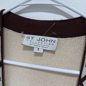 Vintage St. John Cream Black Open Cardigan Sweater Shirt Geometric Pockets Small