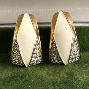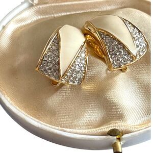 Vintage St. John Cream Enamel Rhinestone Clip On Goldtone Earrings No Box