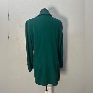 Vintage dark green St. John Collection button-up sweater coat blazer with gold knocker buttons. Classic! Vintage size 14 fits modern M-L. Shown unpinned on a size 4 mannequin.