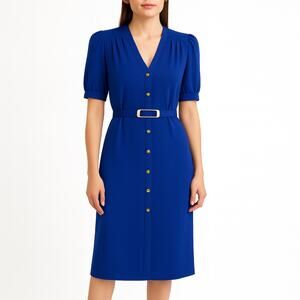 💙 Timeless Vintage Luxury: This St. John by Marie Gray Santana Knit Wool Midi Dress in cerulean blue, approx. size 8, is a collector’s dream… captures polished 70s–80s glamour with bold cerulean blue, enameled gold-tone buttons, and a flattering belted silhouette — so that you can radiate confidence in every room.