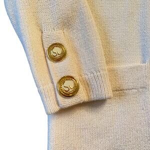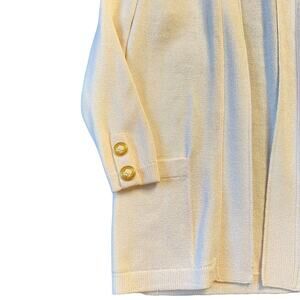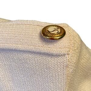 A fabulous vintage cream open front cardigan sweater jacket trimmed with gold tone button accents at shoulders and sleeves. Pockets at either side. Oversized fit. Removable shoulder pads. St. John Separates. size Medium. Wool/Rayon