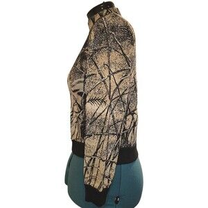 Made from a soft tight knit blend fabric, it features a mock neck with a zip shoulder detail and metallic bead accents. The sweater has a pullover style with a unique animal print pattern, perfect for a variety of occasions from casual to workwear. With its vintage lightweight design and glimmering metallic bead accents, this sweater is sure to make a statement and stand out from the crowd. This vintage sweater is said to be a rare find.