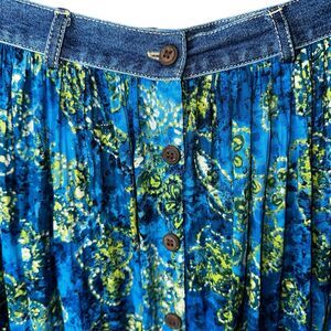 boho skirt, festival fashion, cottagecore outfit, vintage maxi skirt, button front skirt, denim waistband, Y2K aesthetic, hippie gypsy, witchy style, bohemian fashion, prairie skirt, coastal cowgirl, bohemian, hippie revival, colorful, artsy, art to wear