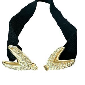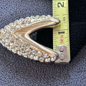 Vintage glam crystal pave set gold tone St John’s belt buckle with tiny black Santana belt. The buckle measures approximately 4” long and 1.5” high, lots of sparkle and shine. It does have a Satana black fabric belt attached. The belt is tiny and you will probably want to replace with a new fabric belt to fit you, unless you are blessed with a 18” waist. Wonderful st John’s over the top glam, please see all photos for full details. There are approximately 125 brilliant crystals on this lively item.