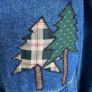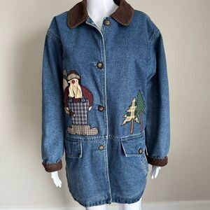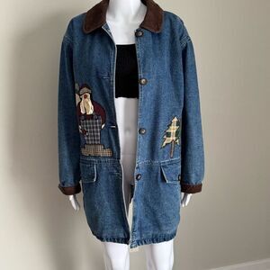 Vintage St. John’s Bay Denim Embroidered Patchwork Winter Holiday Santa Barn Jacket With Corduroy Trim, Very Hard To Find And Unique Piece, Size L, Oversized Fit, Pit~Pit 24”, Length 34”, Very Good Pre-Owned Condition