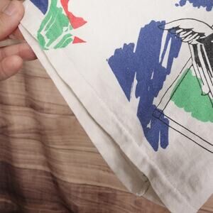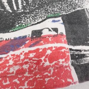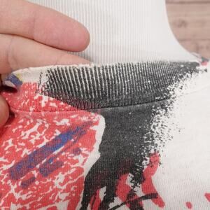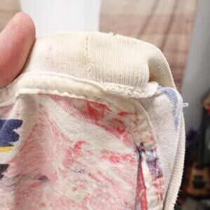 Good vintage pre-owned condition. Typical soft wear and fading with cracking to the print. Light discoloration/yellowing noted near the shoulder seam and collar; wear to collar ribbing. Some loose threads/minor fraying at sleeve/hem edges. No major holes observed. Please review all photos for exact condition. No Size Tag. See Measurements.