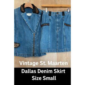 Vintage St. Maarten Dallas Denim Skirt Set Small Vest & Mini Skirt Leopard Trim