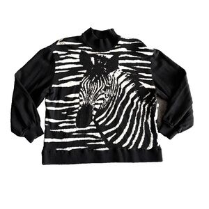 This is a vintage St.John Collection by Marie Gray featuring a bold, black and white zebra print.The sweater has a black mock turtleneck collar with a side zip for closure.Pullover style with long sleeves that end in a ribbed cuff, matching the ribbed waistband.The main body of the sweater is a striking zebra print, with a full zebra head and torso featured prominently on the front with some rhinestones accents on it.The stripes of the zebra continue downs the arms.