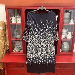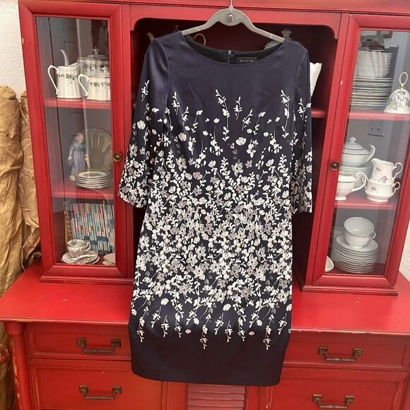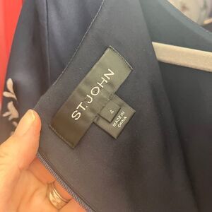 St John Silk & Spandex Floral Print Shift Dress Navy Silver Size 4