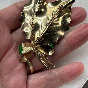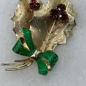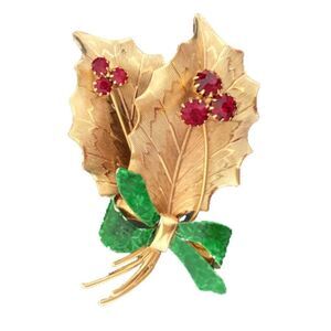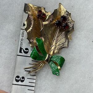 Vintage St.Labre Holly cut glass enamel brooch. Two gold colored leaves with red rhinestone cut glass decor. Stamped on back.