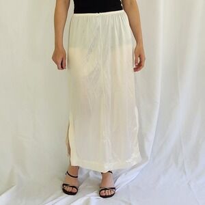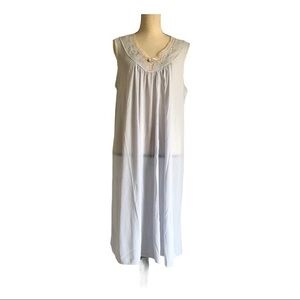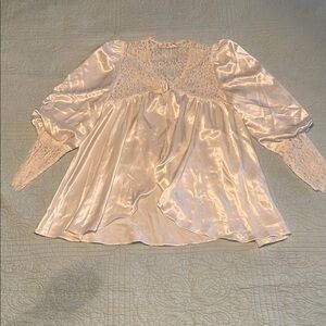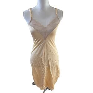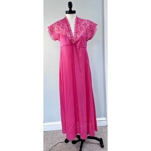 Long maxi length pink sleeveless satin nightgown with cream colored lace at chest. Has a few flaws near bottom hem as shown in pics.
