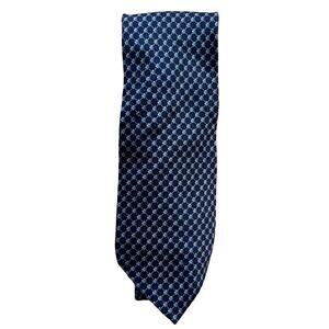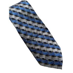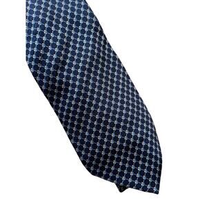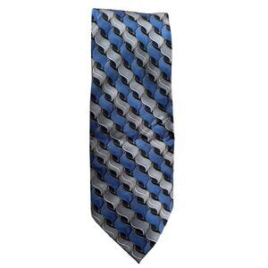 Three all silk blue ties from Stafford. The first tie has a 70s diamond shape vibe, the second is more like waves with silver mixed in and the third is checked. No flaws to note. Cleaned and stored in a smoke free home.