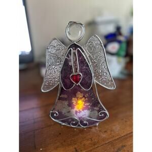 Vintage Stained Glass Angel Tealight Candle Holder 8 inches tall.