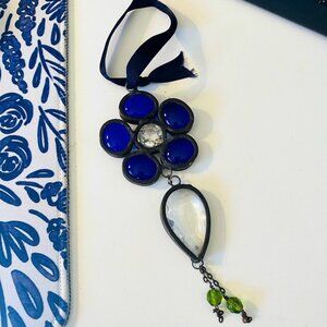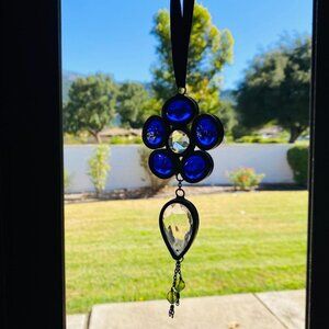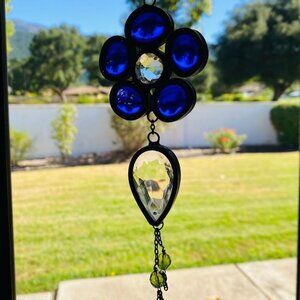 Vintage Stained Glass Flower Floral Suncatcher Cobalt Blue