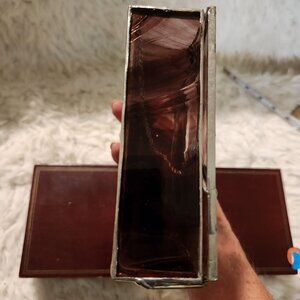 Some minor tarnish on metal edges. Top to bottom = 2 inches. Side to side = 5.5 inches. Front to back = 6 inches.