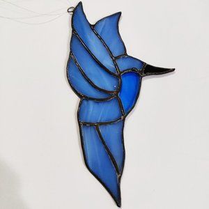 Brightness for Your Blue Period. Set of beautifully hand crafted stain glass sun catchers in larger size. Sweet fluttering hummingbird in sapphire blue & deep purple Iris pair. All to filter colored sun beams to your happy home.