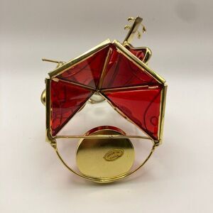 Vintage Stained Glass Tea Light Candle Holder Red/Gold Angel Playing Violin