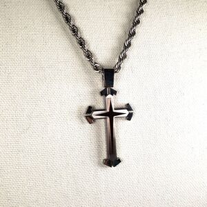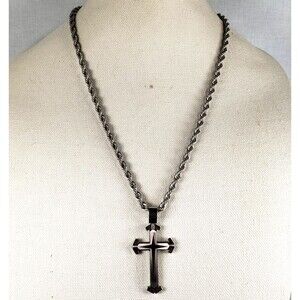 Vintage Stainless Steel 3D Cross Pendant Thick 23" Rope Necklace