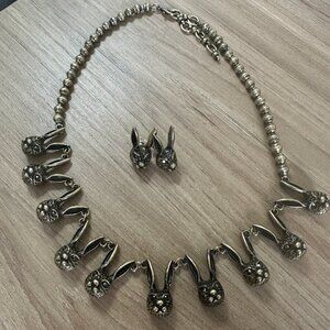 Vintage Stainless Steel Jewelry Rabbit Head Necklace Chain & Earrings
